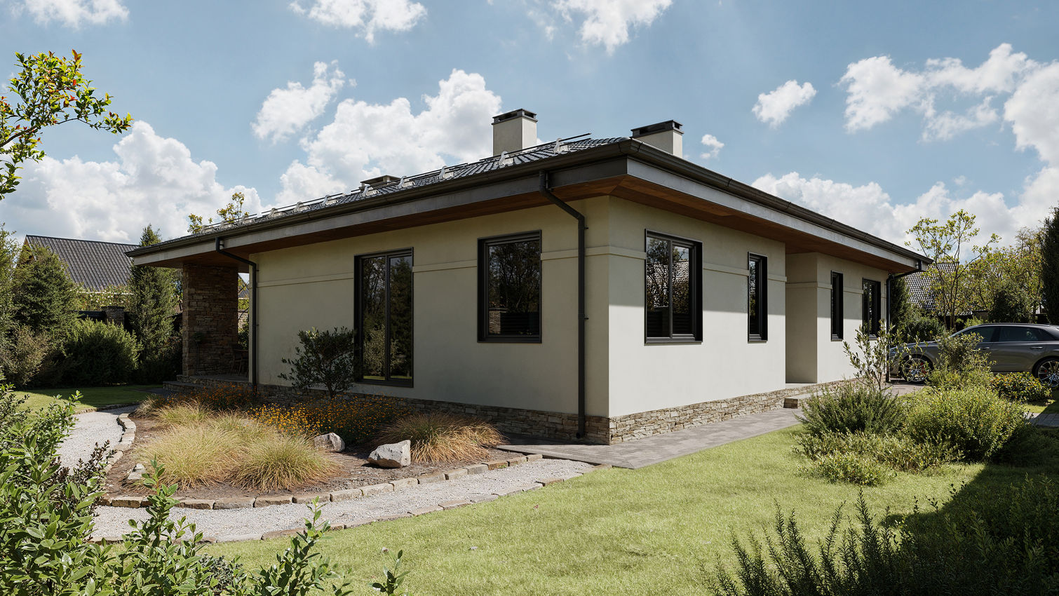 Стіни оздоблені молочною штукатуркою, що м’яко відбиває денне світло, створюючи відчуття простору та спокою. Контрастом до світлого фасаду виступають стильні чорні рами вікон, які акцентують сучасний характер будівлі.