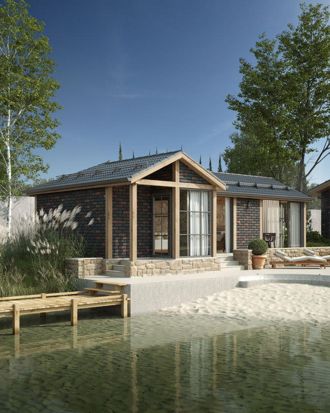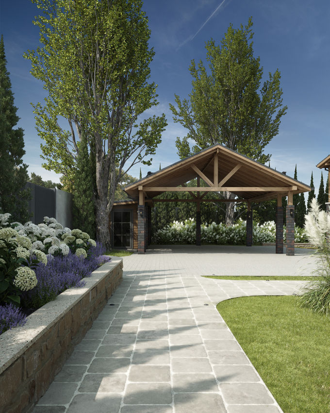 Зовнішній благоустрій доповнений зеленню та атмосферним освітленням, що створює комфортну зону для зустрічей, розмов і кавових моментів.