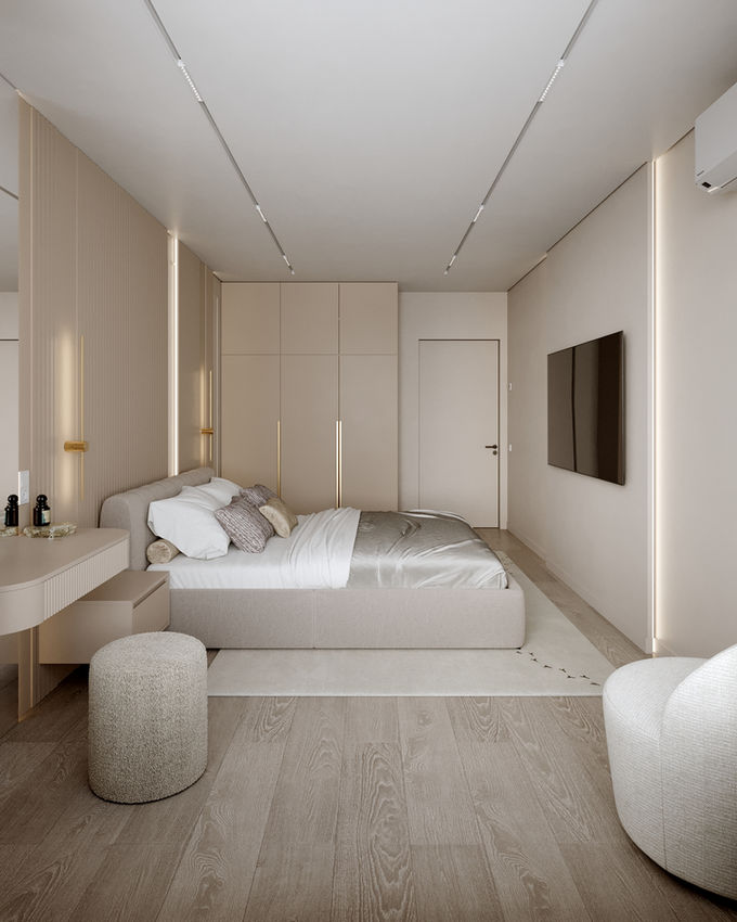 Ця двокімнатна квартира — про спокій, світло і дотик. Простір, де панує теплий беж, він обгортає з усіх сторін і налаштовує на повільне, усвідомлене життя. Світло тут — головний митець. Воно струмує з-під стелі, м’яко ковзає стінами, лягає на текстури, змінюючи настрій кімнат від світанку до ночі.