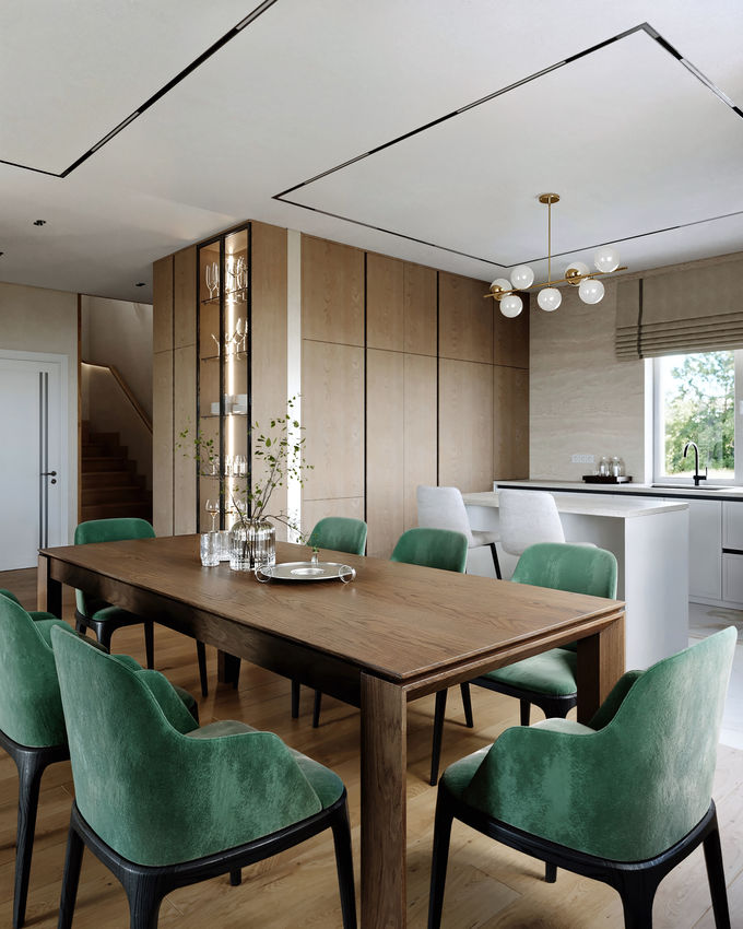 Інтер’єр двоповерхового заміського будинку — це витончене поєднання класики й сучасності, де натуральні матеріали, глибокі кольори та увага до деталей створюють гармонійний, затишний простір. Вже у передпокої відчувається характер дому: вертикальні дерев’яні рейки додають ритму, а напівкругле дзеркало на тлі венеціанської штукатурки м’яко віддзеркалює світло. Об’єднана зона кухні та вітальні вирізняється контрастом між класичною основою й яскравими акцентами. Смарагдові штори, обідні стільці й подушки, а також теплі помаранчеві відтінки створюють живу, але зібрану атмосферу. Насичене дерево в меблях додає глибини, а латунні люстри над простором підкреслюють витонченість інтер’єру. Функціональність зберігається завдяки кухонному острову, прихованій коморі та чіткому зонуванню: на кухні — керамограніт під білий мармур із золотими прожилками, у всьому іншому домі — плитка під дерево. Загальна кольорова палітра — тепла, бежево-натуральна, з класичними бра на сходах, які підтримують стиль будинку. В кабінеті переважає дерево та шкіра, що створює атмосферу спокою та зосередженості. На другому поверсі — спальні, кожна зі своїм настроєм, але об’єднані спільним підходом до гармонії кольору й фактур: дерево, світлі нейтральні відтінки, а подекуди — акценти сірого чи блакитного. Два санвузли — по одному на кожному поверсі — продовжують загальну естетику: стримано, функціонально й зі смаком.