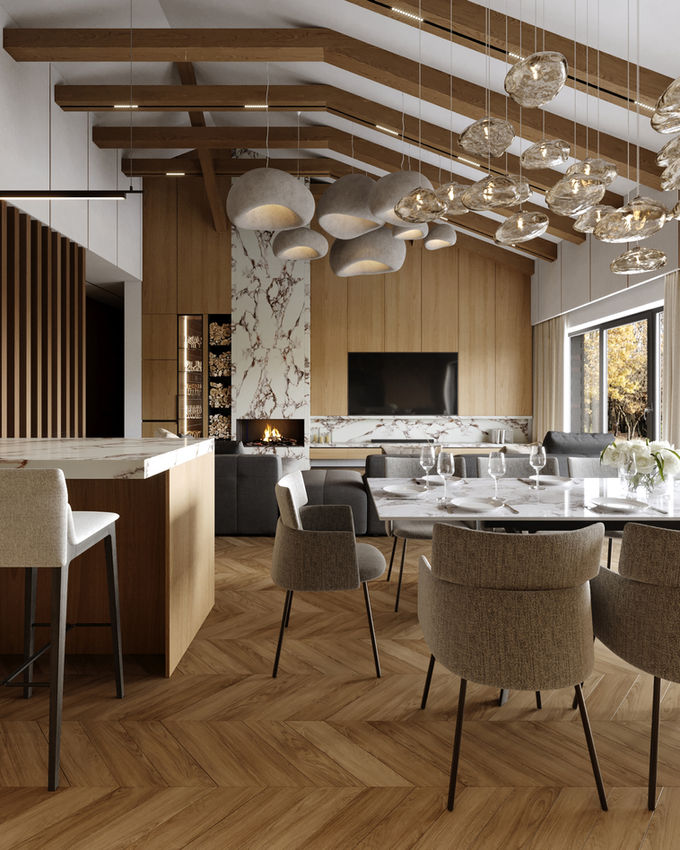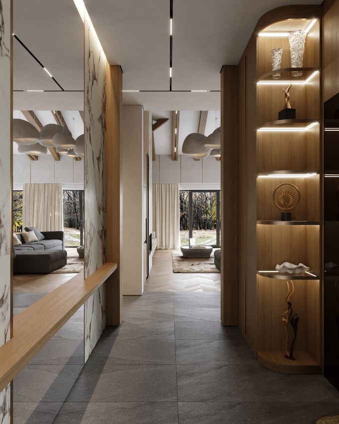 Інтер’єр цього будинку — мов налаштована симфонія, де кожна деталь має свій голос. Простір починається зі стриманого передпокою з керамогранітом і натуральними текстурами, де мінімалізм доповнено тонкими латунними акцентами. Вітальня, наповнена світлом і теплом дерева, перетікає в кухню та їдальню, утворюючи єдиний затишний простір. Панорамні вікна відкривають краєвид на Стугну, ніби впускаючи природу всередину.