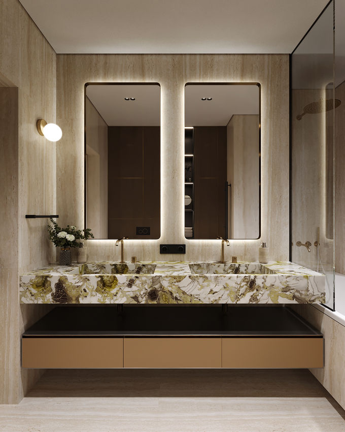 Майстер-санвузол — вишуканий і функціональний: темне дерево, мармур, золото і вбудовані системи зберігання. Цей дім — про емоцію, деталь і відчуття цілісності, де кожна кімната розповідає свою історію.
