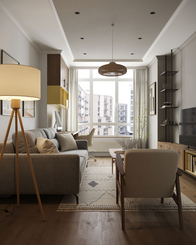 В інтер’єрі багато світла, текстилю та приємних на дотик фактур, що надають житлу тепла та затишку. Дзеркала візуально розширюють кімнати, розсувні конструкції економлять простір, а кожен елемент — від декоративних ніш і підвіконь до вбудованих шаф і робочих зон — продуманий до дрібниць. Абстрактні картини, дизайнерські світильники й кольорові акценти надають інтер’єру характеру та підкреслюють індивідуальність власниці. Це дім, де хочеться жити у власному ритмі — спокійно, стильно та з натхненням.