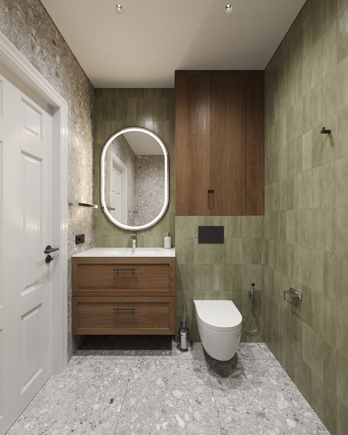 Ця квартира — приклад сучасного інтер'єру, де продуманість деталей поєднується з атмосферою спокою та затишку. Прості форми, природні матеріали та японські мотиви створюють естетику гармонії й внутрішнього балансу. Дерево й камінь у стриманих відтінках, оливкові стіни, латунна фурнітура та жива зелень на металевих полицях формують виразний, але водночас м’який і природний образ простору.