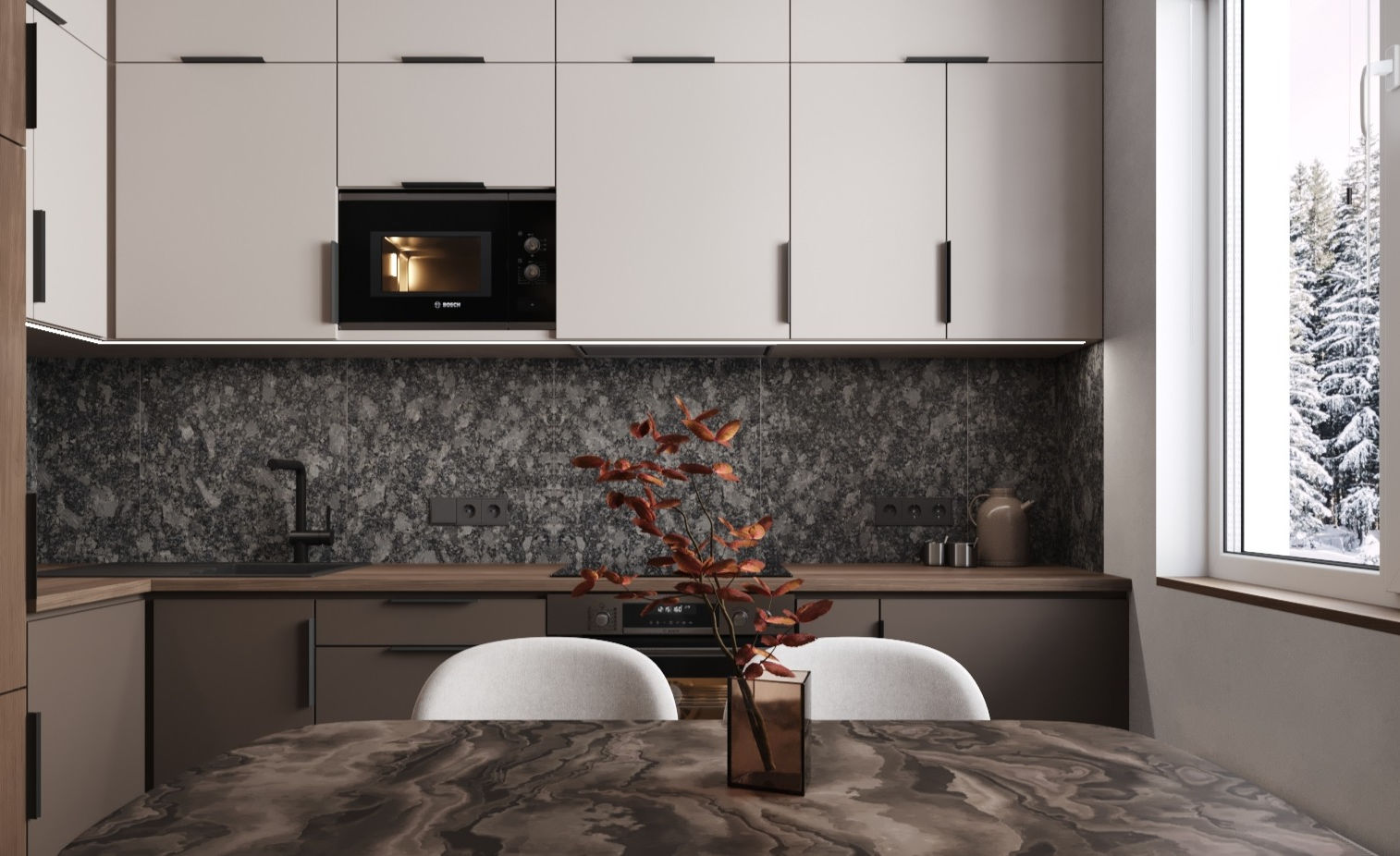 Заходиш у квартиру — і першим зустрічає світлий передпокій, де велике дзеркало відбиває світло і ніби запрошує заглянути за межі буденного простору. На кухні, у затишному куточку, гармонійно розташувався акцентний диван із столом — ідеальне місце для ранкової кави чи спокійного обіду. Полиці з книгами та улюбленими дрібничками додають дому індивідуальності, а пастельні тони меблів ніби шепочуть про спокій і порядок.