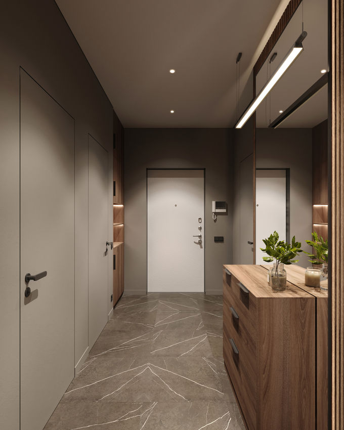Передпокій цієї затишної квартири — справжній майстер-клас лаконічності. Маленьке приміщення, де двері з прихованим монтажем практично зникають на тлі стін, створюючи відчуття простору. Головним акцентом тут стала зона комода, доповнена великим дзеркалом, яке відбиває світло і робить коридор візуально ширшим.